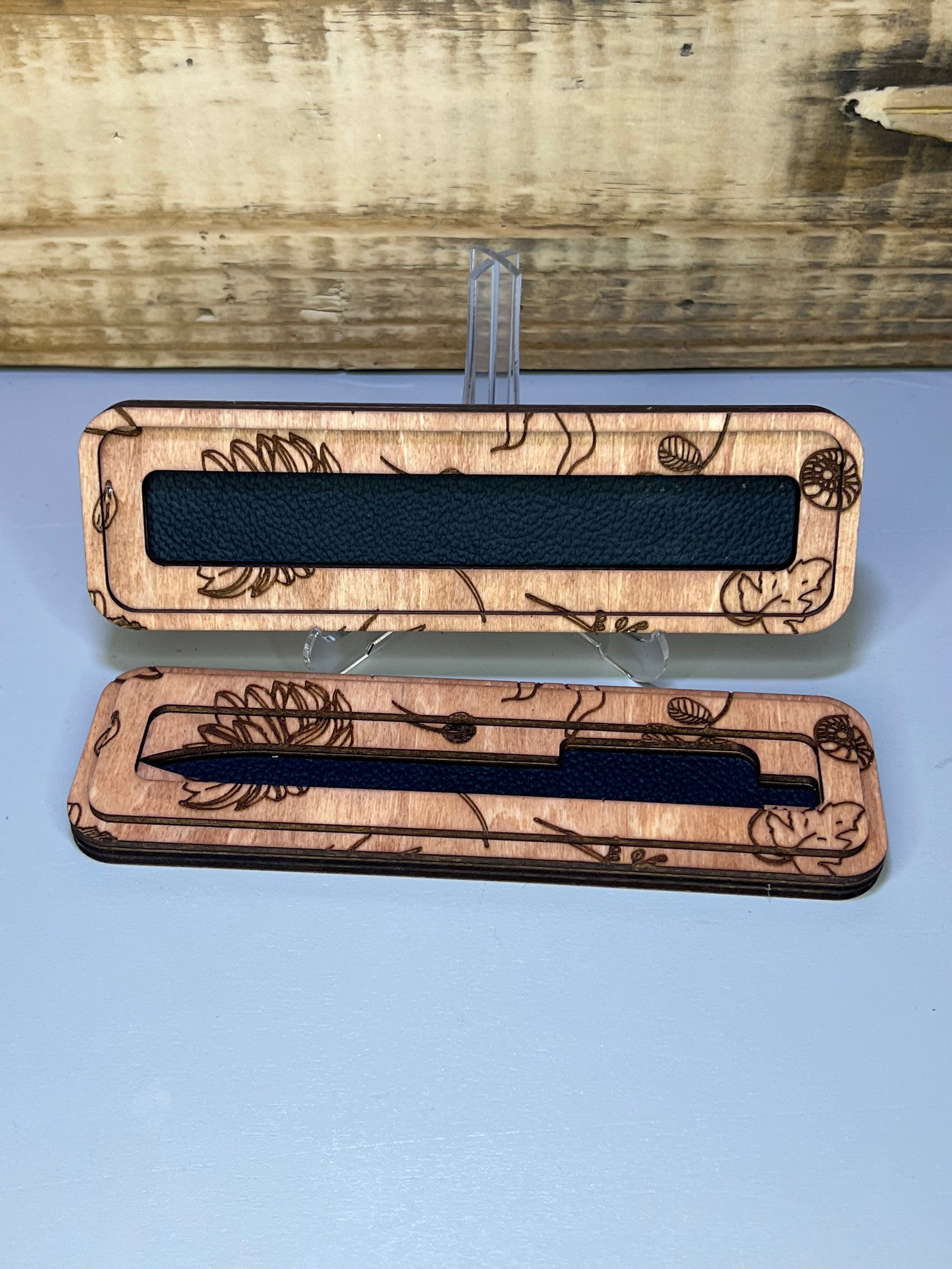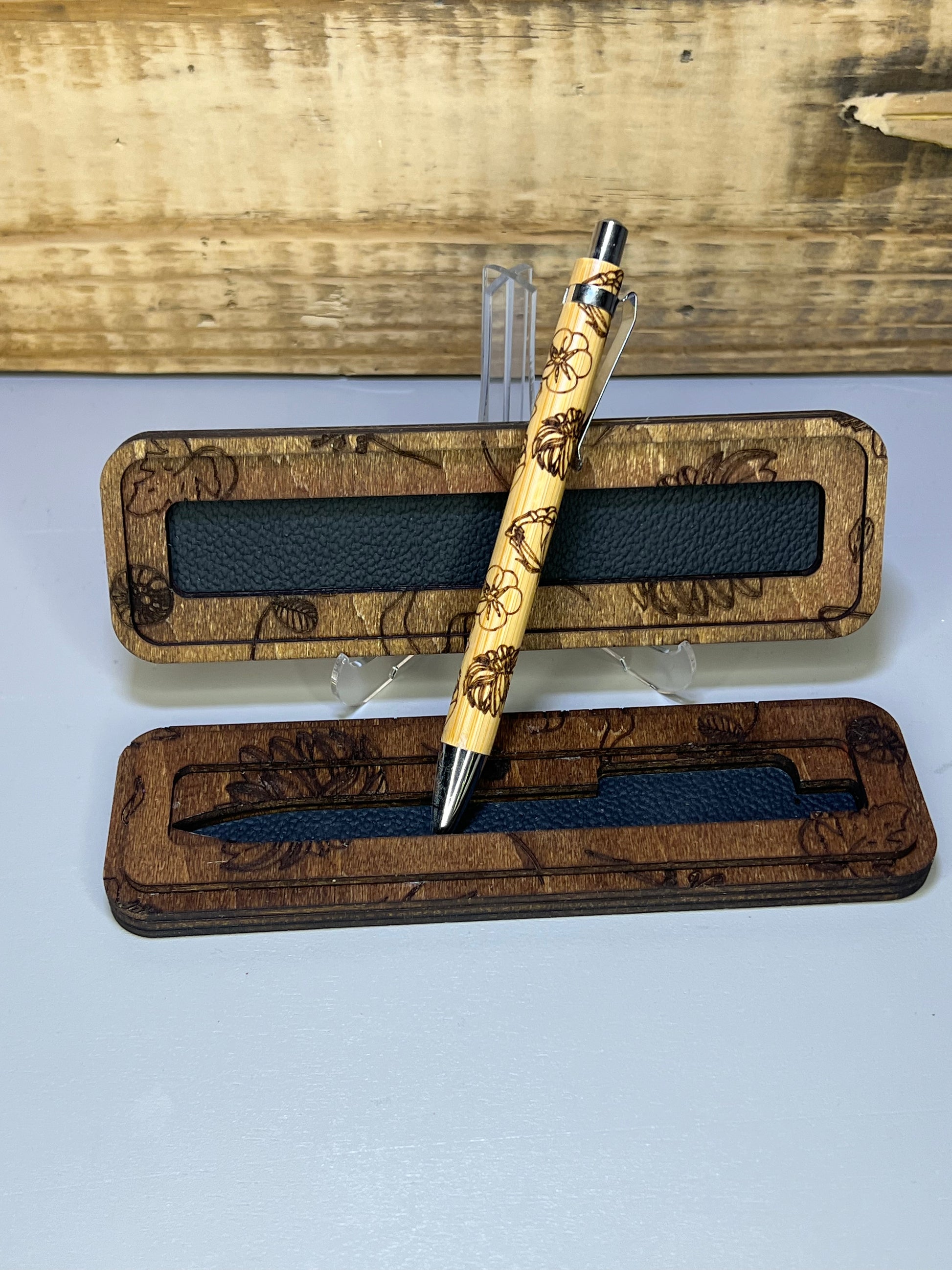 Laser engraved and cut pen box. Pen box is made with birchwood and lined with genuine leather. Pen is a bamboo pen engraved to match.